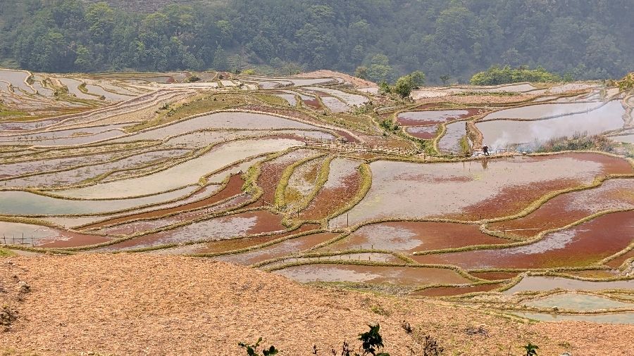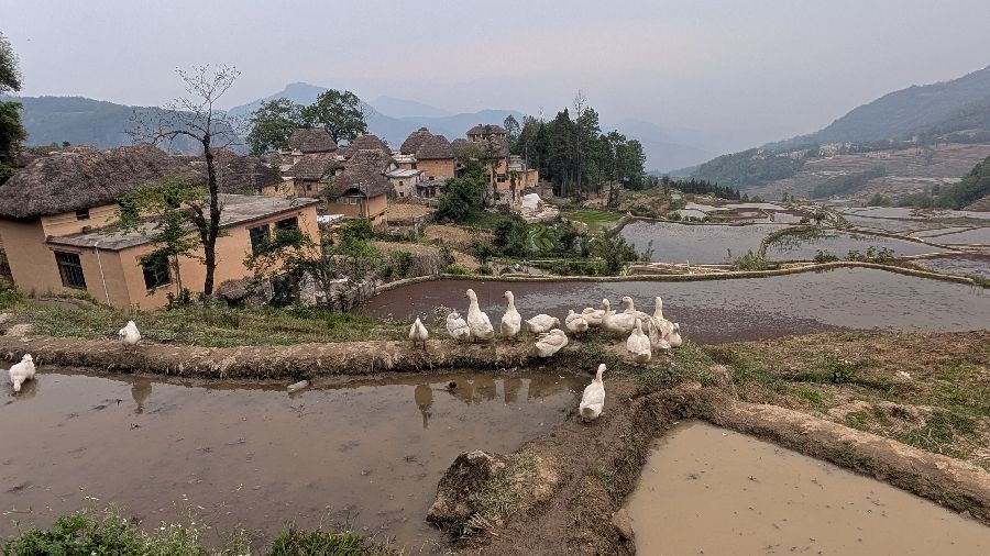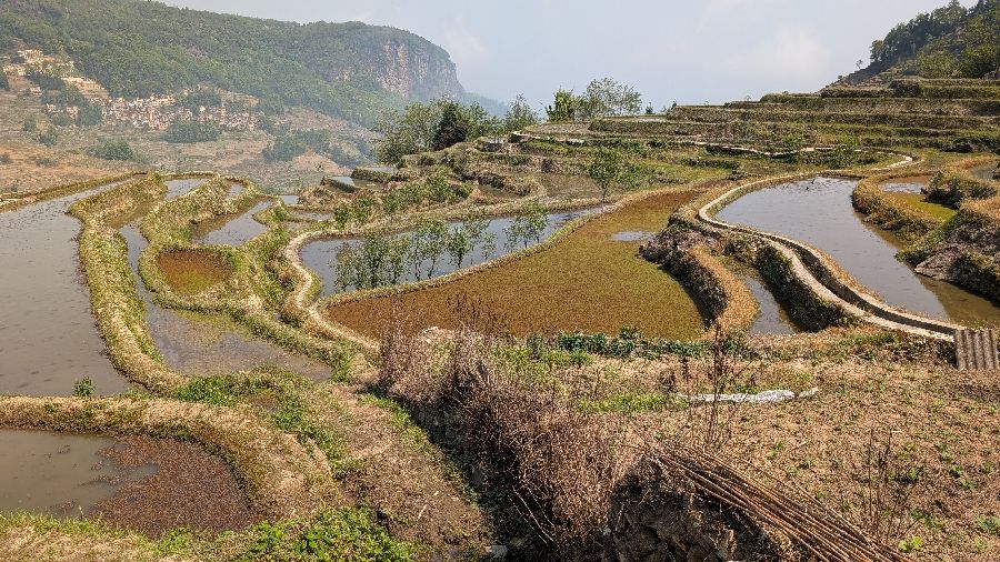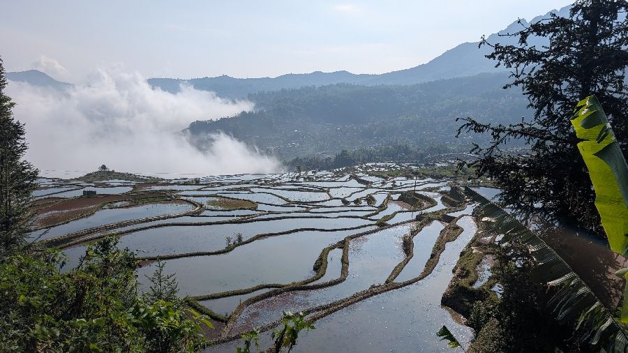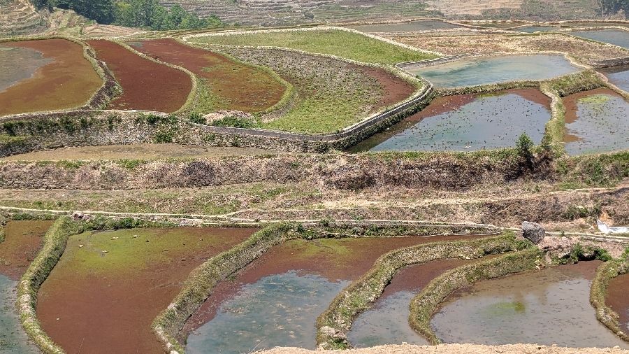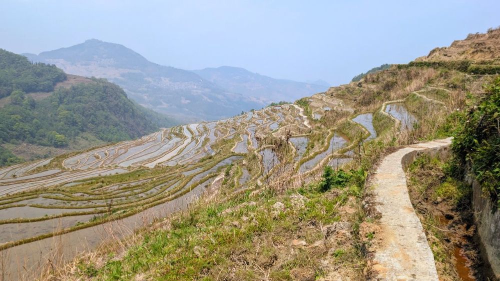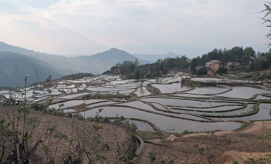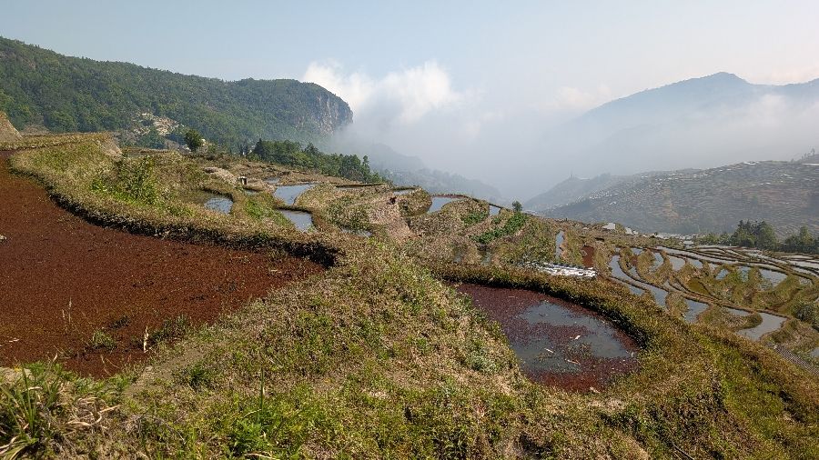 Die Einreise verlief sehr einfach. Ich hatte vorher das online Formular ausgefüllt, keine Warteschlange, Einreisestempel, fertig. Dann fuhr ich direkt mit dem Didi (Taxi) zum Bahnhof und weiter Richtung Yuanyang. Mit dem Zug von Hekoubei nach Honghe, wo ich weitere 3 Stunden im Sammeltaxi saß, zur Unterkunft in Pugao. Die Reisterrassen hier zählen zu den schönsten weltweit. Komischerweise acheinen sie trotzdem nicht so bekannt zu sein. Ich habe rund um die Dörfer in zwei Tagen vielleicht 2 Dutzend Touristen gesehen. In einige Ecken bin ich aber nicht gekommen, die Reisterrassen liegen etwas verstreut. Die Verkehrsanbindung ist auch alles andere als einfach. Das hält sicherlich einige Besucher fern